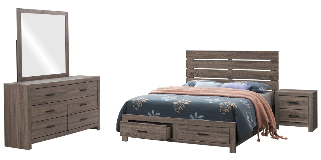 The Brantford bedroom set blends modern style with practical storage. Anchored by a platform bed with a slatted headboard, this set offers both form and function. Two spacious footboard drawers provide extra storage for linens, clothing, or accessories. Crafted from engineered wood with a durable laminate veneer, each piece is built for longevity.Read More