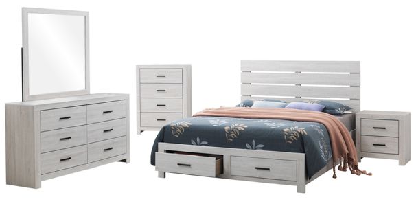 Bedroom set centered around a platform bed with built-in storage drawers