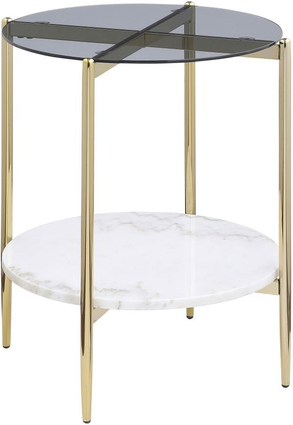Put a glam spin on a living room seating area or chic entry with a modern round end table. It catches the eye with a gleaming gold finish structure, including slim legs and crossing stretchers. A smoke gray glass tabletop highlights the structure of the table, offering fresh, modern appeal.Read More