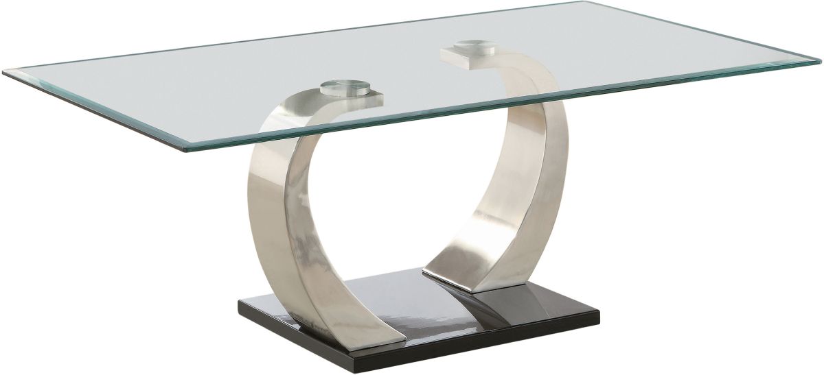 Constructed from metal, its support is finished in shiny, satiny silver for a pleasing hint of polish. Its floating glass top exudes graceful glamour. Balanced out by a bold, high-sheen black base, this table is the epitome of modern elegance.