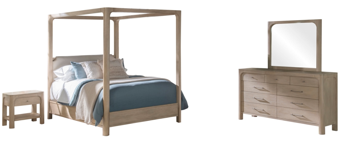With sculptural elegance and quiet drama, this bedroom set centers around a stunning canopy bed framed by arched posts and softened edges. A tailored, upholstered headboard adds comfort and contrast, while coordinating storage pieces echo the same graceful curves and thoughtful detailing.Read More